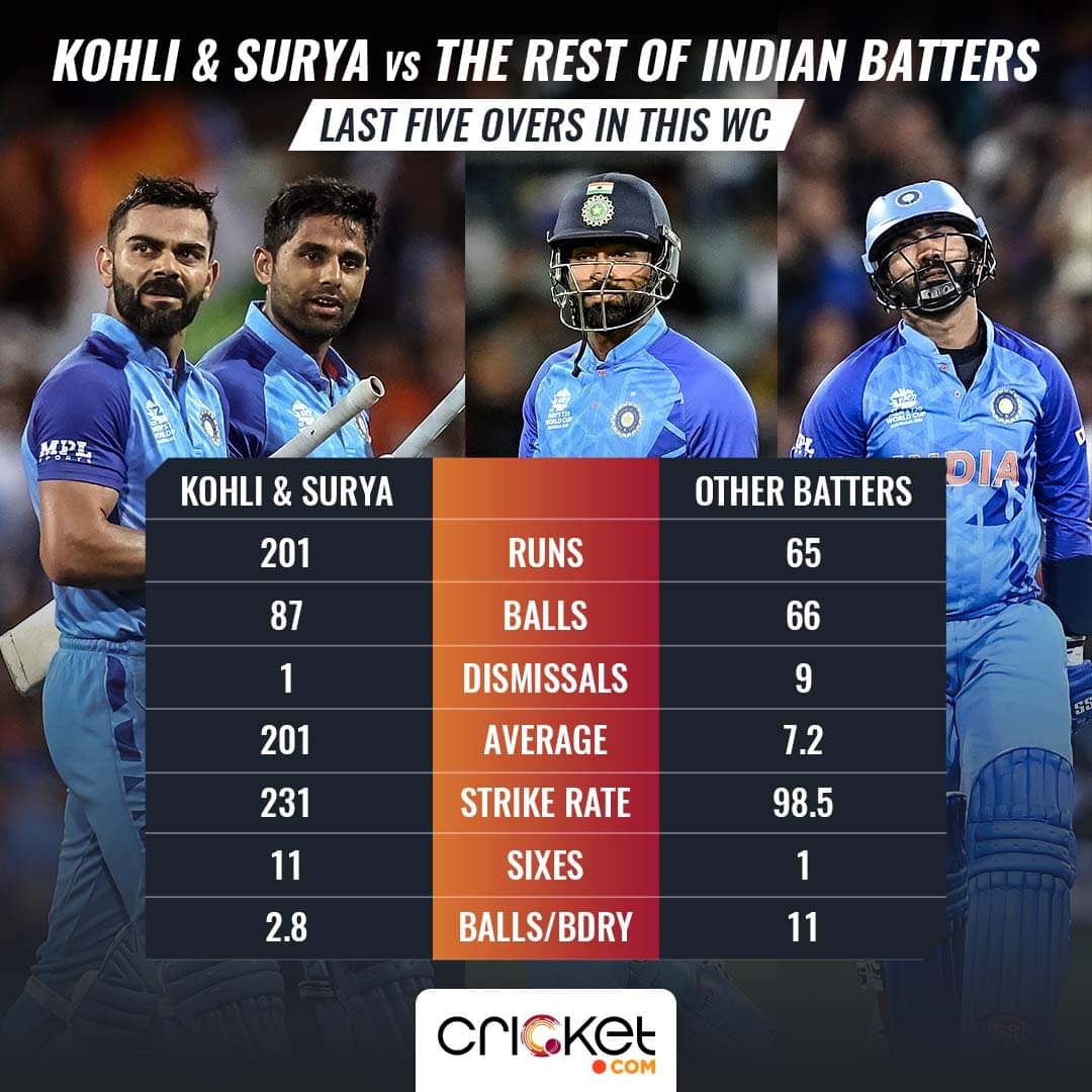 Adding on, India’s number five, six and seven batters have scored at a run rate of 5.3 and have lost a wicket every 9.4 balls (overall). Only the Netherlands have a poorer run rate since the Super 12s began. Their balls/wicket ratio of 9.4 is the third worst. Huh! Finishers.