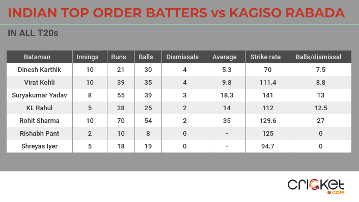 However, he is not the worst hit batsmen. Dinesh Karthik has an average of 5.3 with four dismissals against Rabada. Neither Suryakumar Yadav (18.3) nor KL Rahul (14) average over 20 against the Protean.