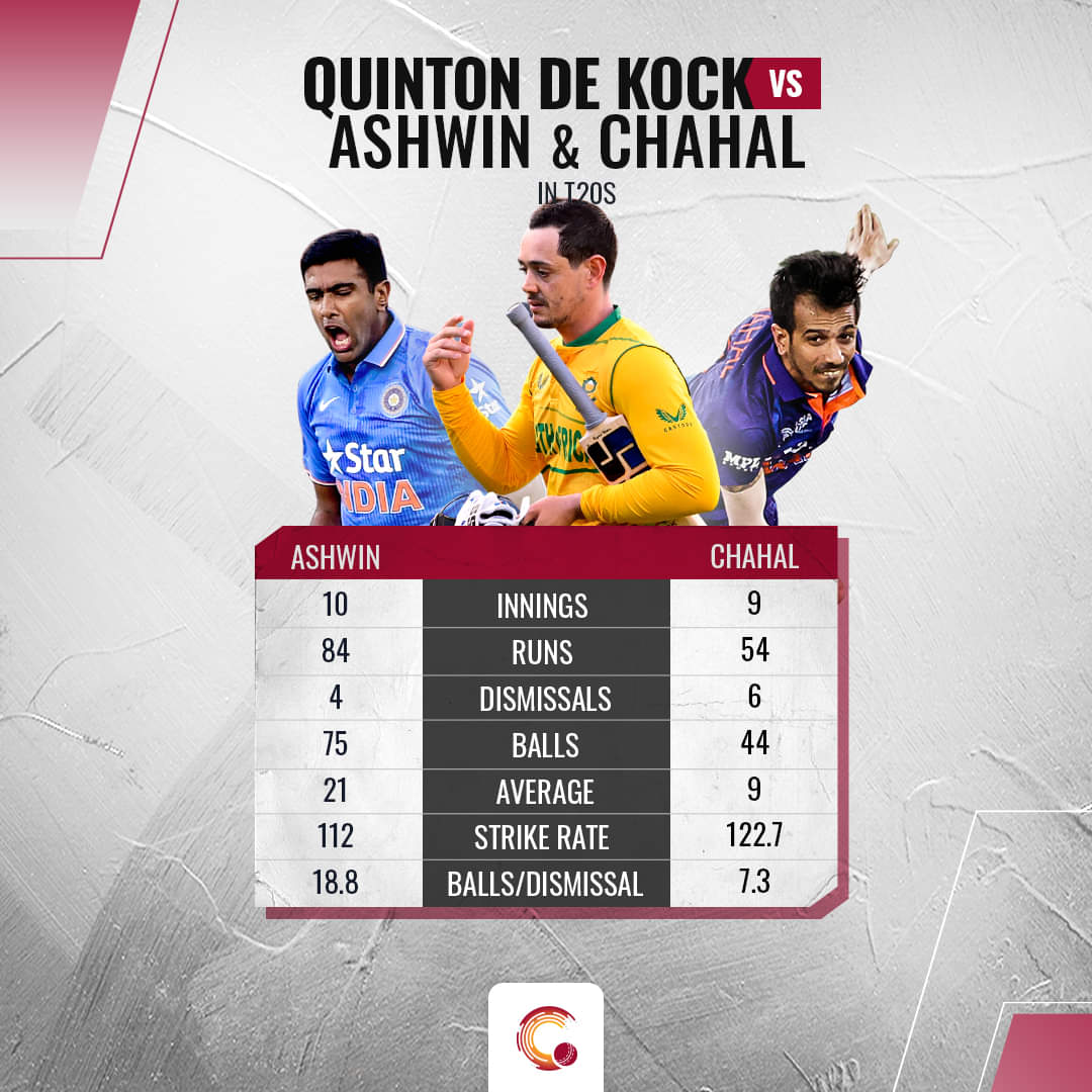 That is not it, even against the likes of Ravichandran Ashwin, de Kock has had his troubles, but not to the extent against Chahal. In 10 innings, de Kock has averaged 21 with four dismissals in 10 innings. He has a strike rate of 112 in those 10 innings against Ashwin.