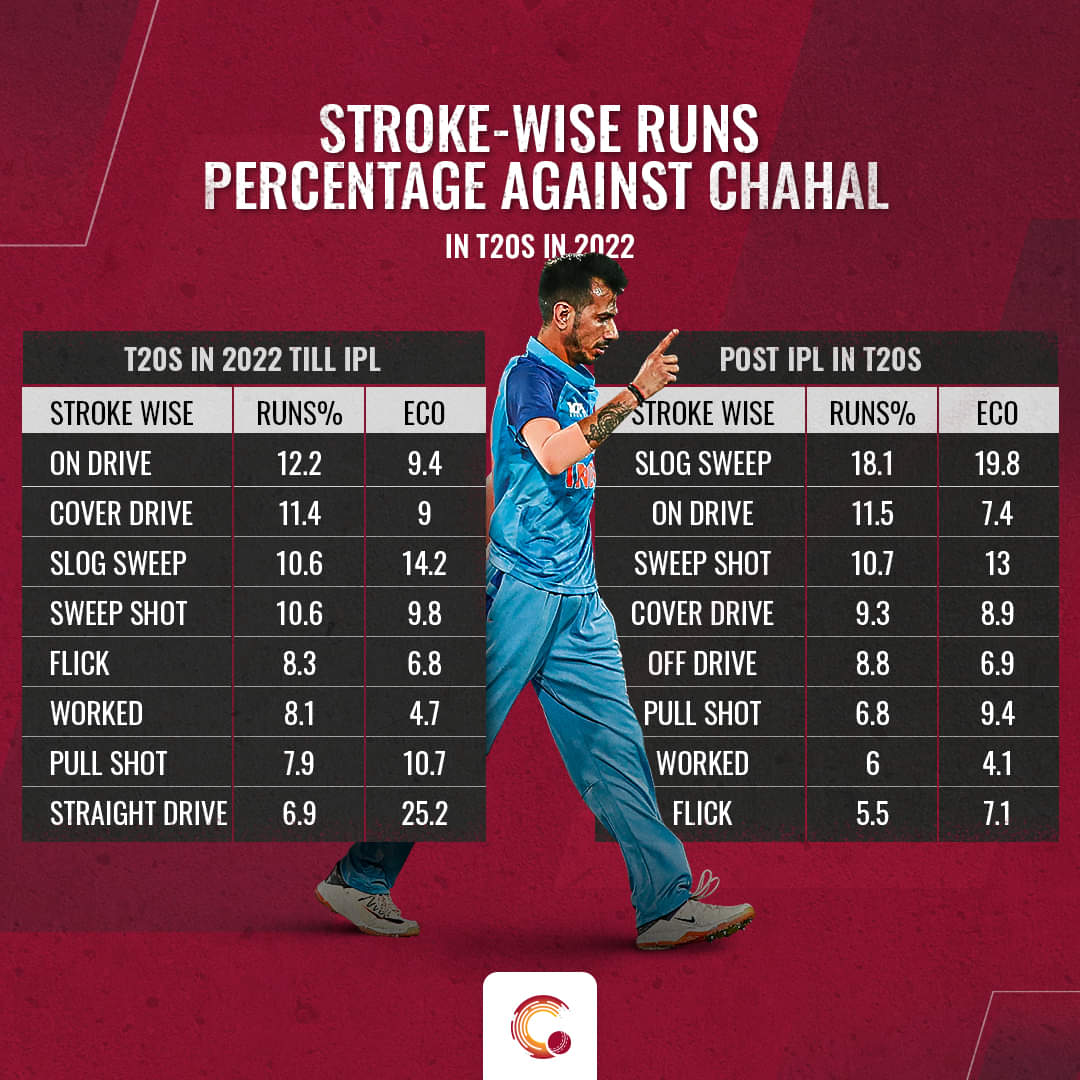 From January till the end of the IPL 2022, Chahal had picked up 31 wickets at an economy of 7.6. In this time frame, Chahal had an economy of 5.8 when he bowled on the stumps. One of the reasons for his low economy was, batters had scored only 10.6 percent of runs through slog sweep. The right handers especially, had scored only 6.3 percent of runs through the slog sweep.