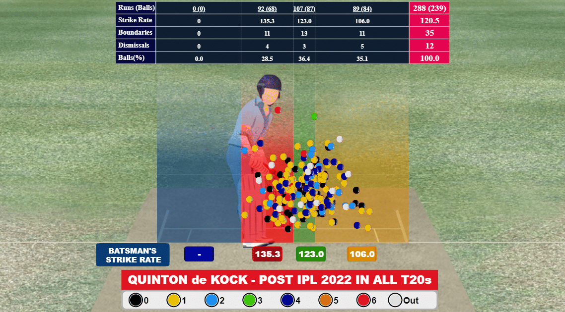 It's not only about dismissals, his strike rate has also taken a hit. In the aforementioned time, de Kock has scored at a strike rate of 106 when bowled wide outside off. However, when bowled on the off-stump channel (4th – 6th stump) he has a strike rate of 123 and 135.3 when bowled on stumps or bodyline.