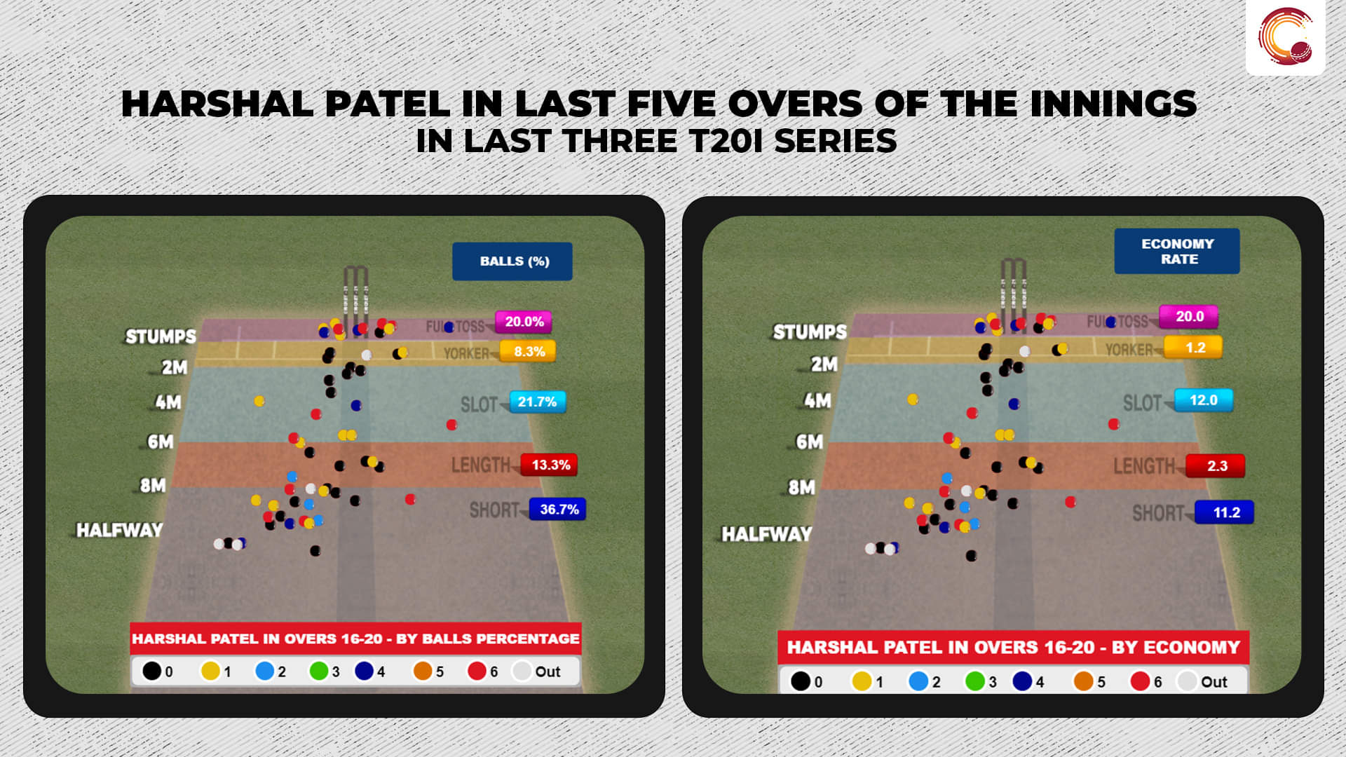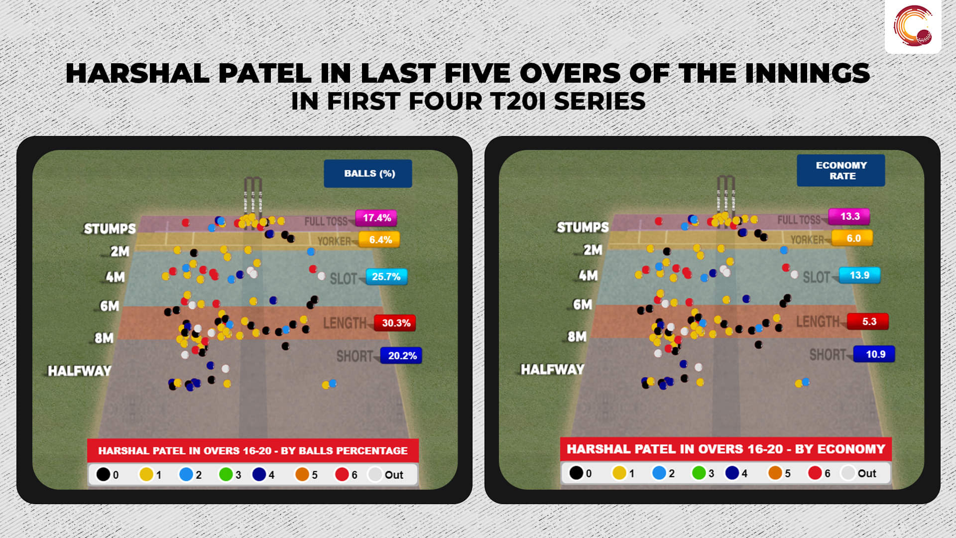 In the first four series, that is 12 innings, Harshal had bowled 30.3 percent of the balls on good length and conceded at 5.3 runs per over. However, when bowled full (25.7 percent), he conceded 13.9 runs/over and 10.9 when bowled back of a length or short (20.2 percent).
