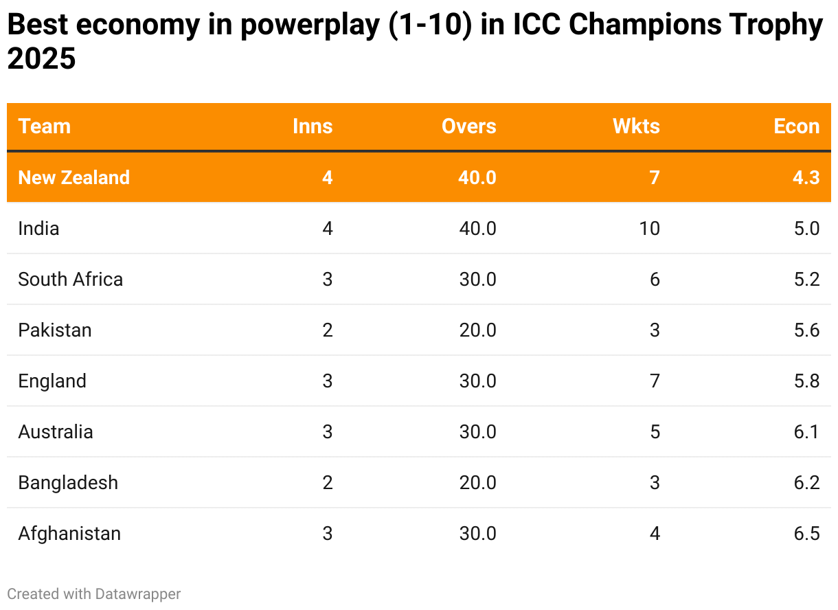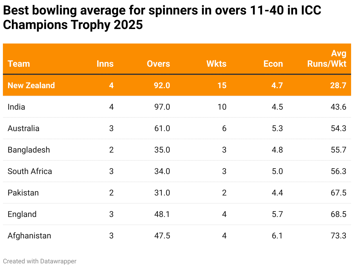 In the middle overs phase between overs 11-40, the spin attack consisting of skipper Mitchell Santner, Michael Bracewell, Glenn Phillips and Rachin Ravindra have in fact been more impactful than Indian spinners, averaging 28.7. They have, by some distance, been the best spin-bowling unit in the middle overs in this Champions Trophy.