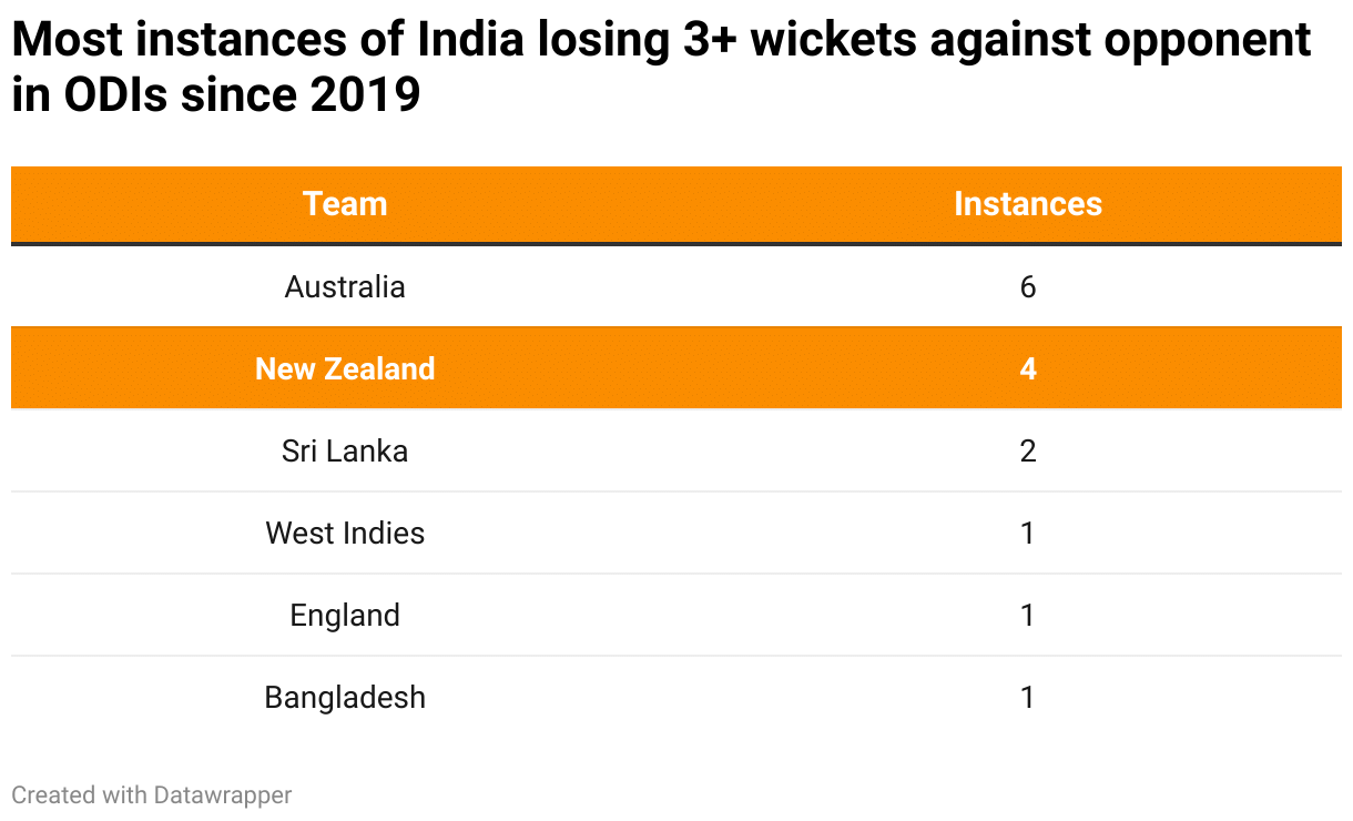 New Zealand have a history of putting team India in trouble early on as they have taken 3+ wickets in first 10 overs on four occasions against India since 2019. Two of those four instances were in ICC events, with the first being in the semi-final of ICC World Cup 2019 where Matt Henry and Trent Boult through India's top order.