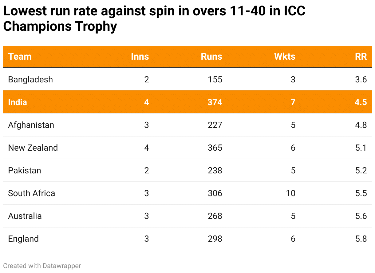 The Indian batters, too, have been vulnerable against spin throughout the tournament as they have failed to score at a decent rate against them, especially in the middle overs. India's run rate of 4.5 against spin in overs 11-40 is the second lowest amongst all teams in this CT.