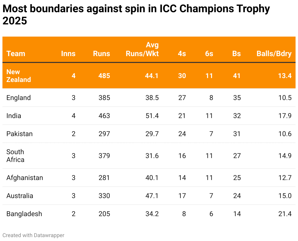 Barring the India match, the Kiwi batters have dominated the spinners in the tournament, smashing them to the cleaners by hitting the most boundaries (against spin) in this competition so far. They have the third best average against spin and have hit the most fours and joint most sixes in the tournament against the tweakers.