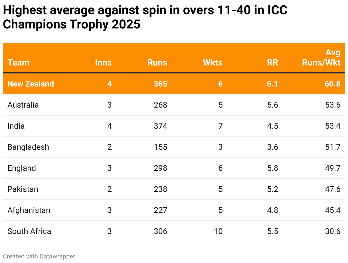 The batting of the Kiwis in the middle overs has been spectacular against spin. They have managed to score at a decent run rate of 5.1, managing both strike rotation and boundary hitting. This has resulted in them averaging 60.8, which is far better than any other team in this phase.