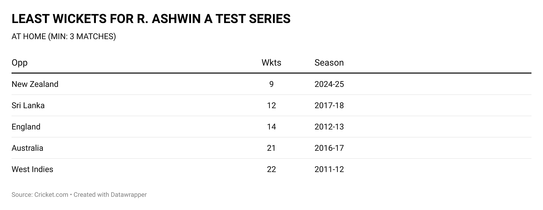 One of the reasons New Zealand managed to walk away with the series was because Ravichandran Ashwin had a quiet series. With 383 scalps at 21.57 in home conditions, Ashwin, without a shadow of a doubt, has been a constant match-winner for over a decade. However, against New Zealand, he failed to have an impact, managing just nine wickets - the least for him in a 3+ matches series at home.