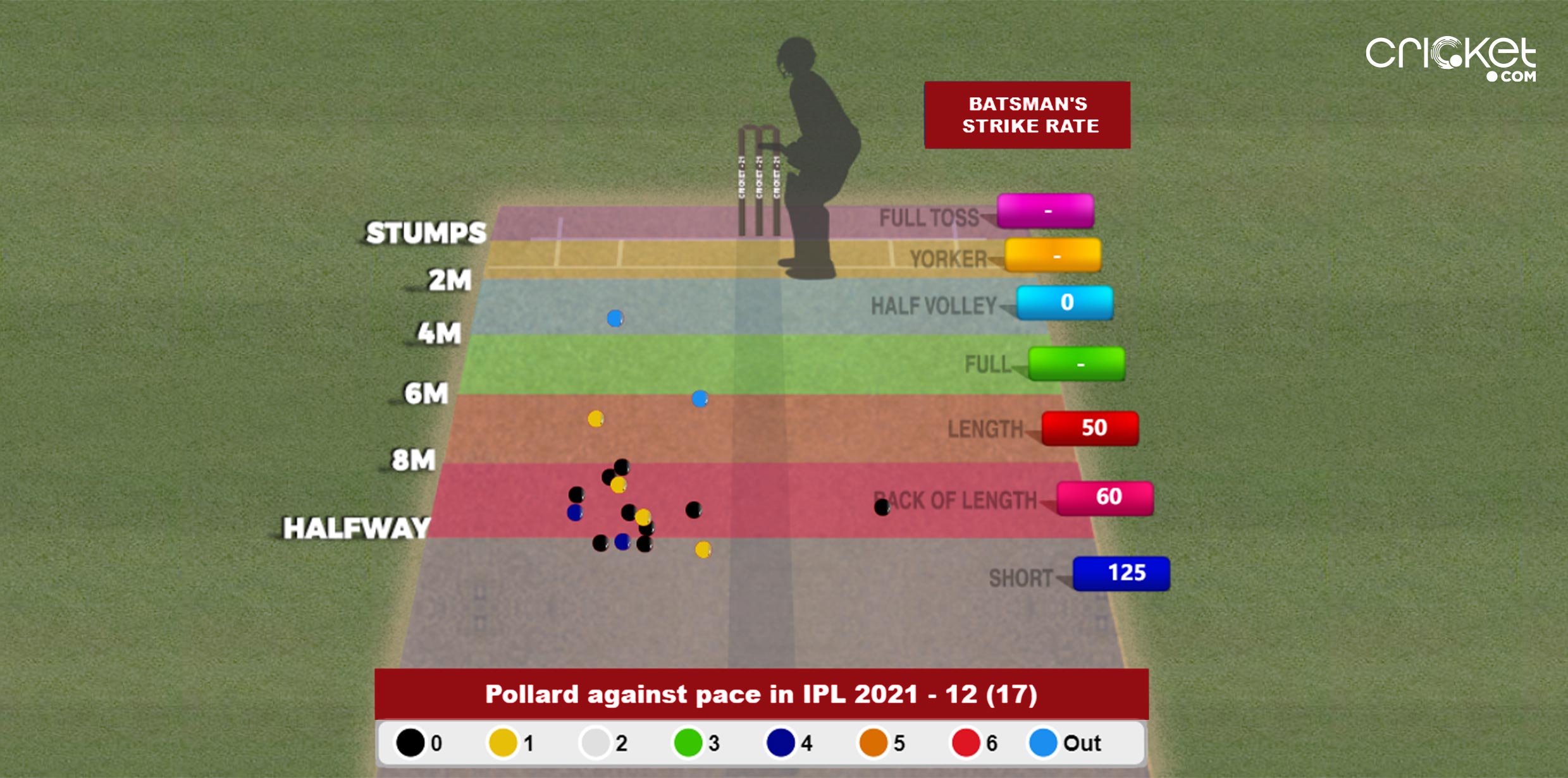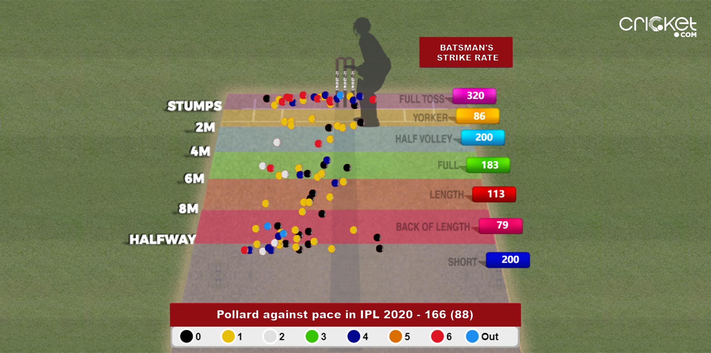 A bowler considered good at the death is usually the one with a high yorker accuracy. But, in the case of Pollard, it becomes a high-risk option as either side of a yorker, his strike rate is above 200 as we can see from the graphic from last season.