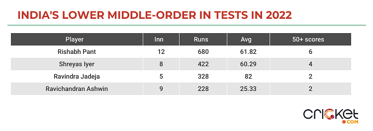 Complementing Pant throughout the year was Shreyas Iyer, who after debuting in late 2021, came into his own in Test cricket in 2022. He made series-defining contributions against Sri Lanka and Bangladesh and finished the year with an average of 60.29. The 28-year old has cemented himself as a lock in sub-continent conditions.