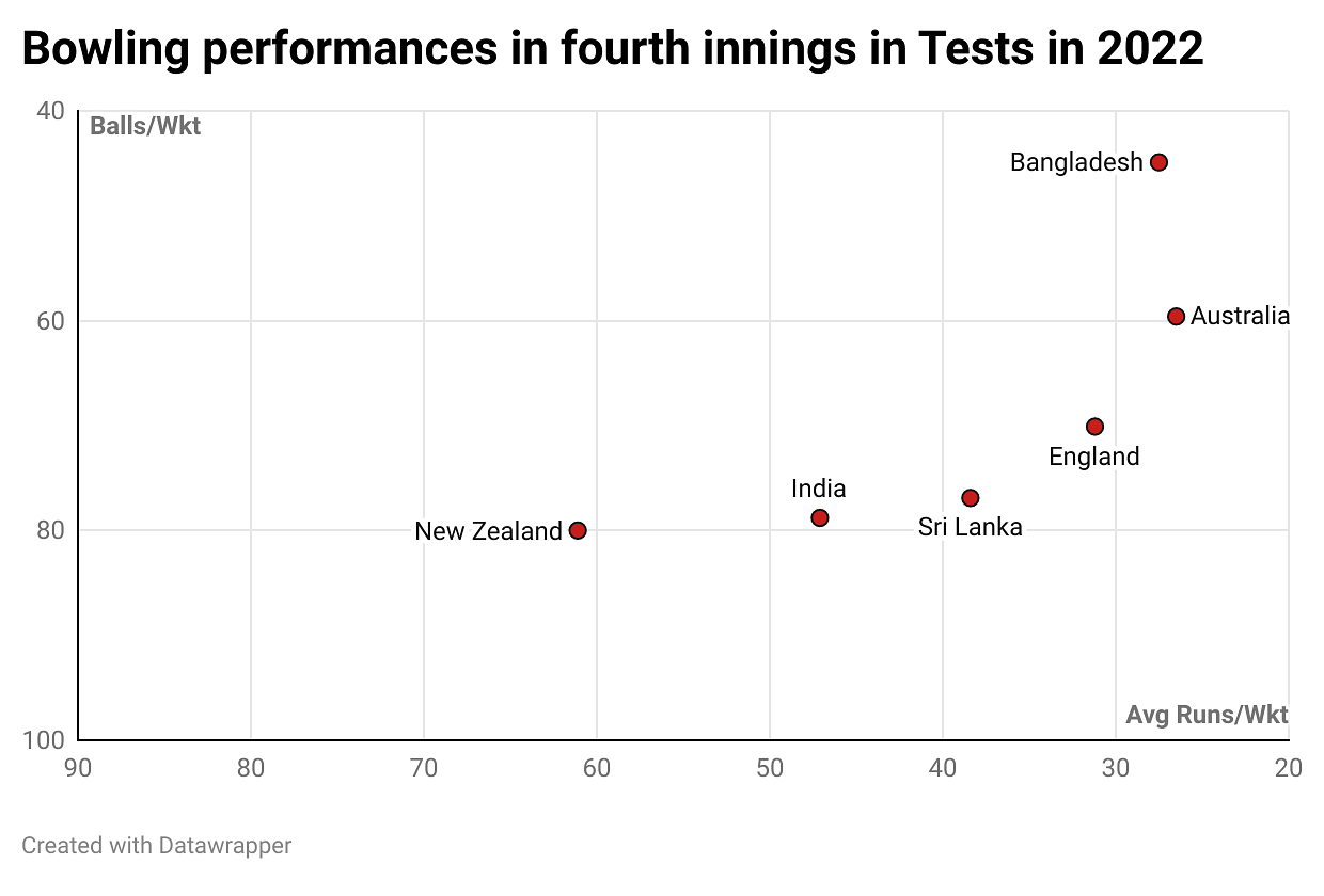 India’s average of 47.1 with the ball in the fourth innings in 2022 goes down as the second-worst among all sides, behind New Zealand’s 61.1.