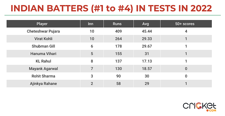 Little signs of encouragement shown across the England series and the Centurion Test in South Africa turned out to be a false dawn as India’s Top 4, overall, disappointed and let the side down. Across 13 innings, India’s Top 4 batters averaged just 29.1 in Tests in 2022, the third-worst behind Bangladesh and South Africa.