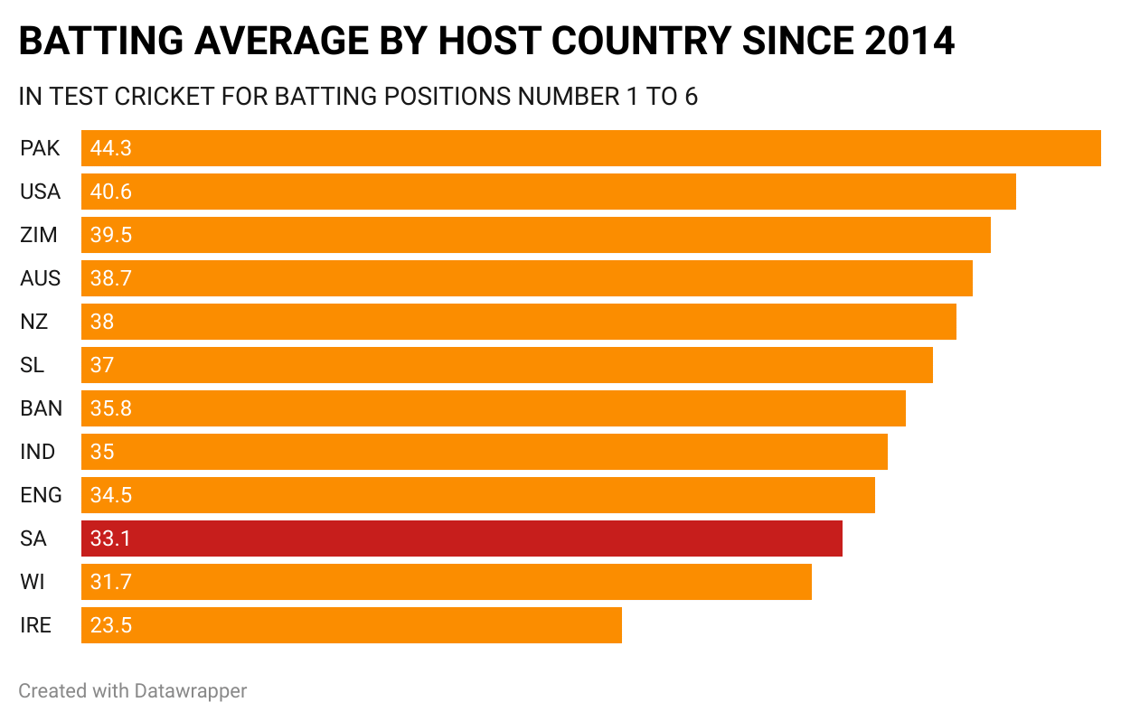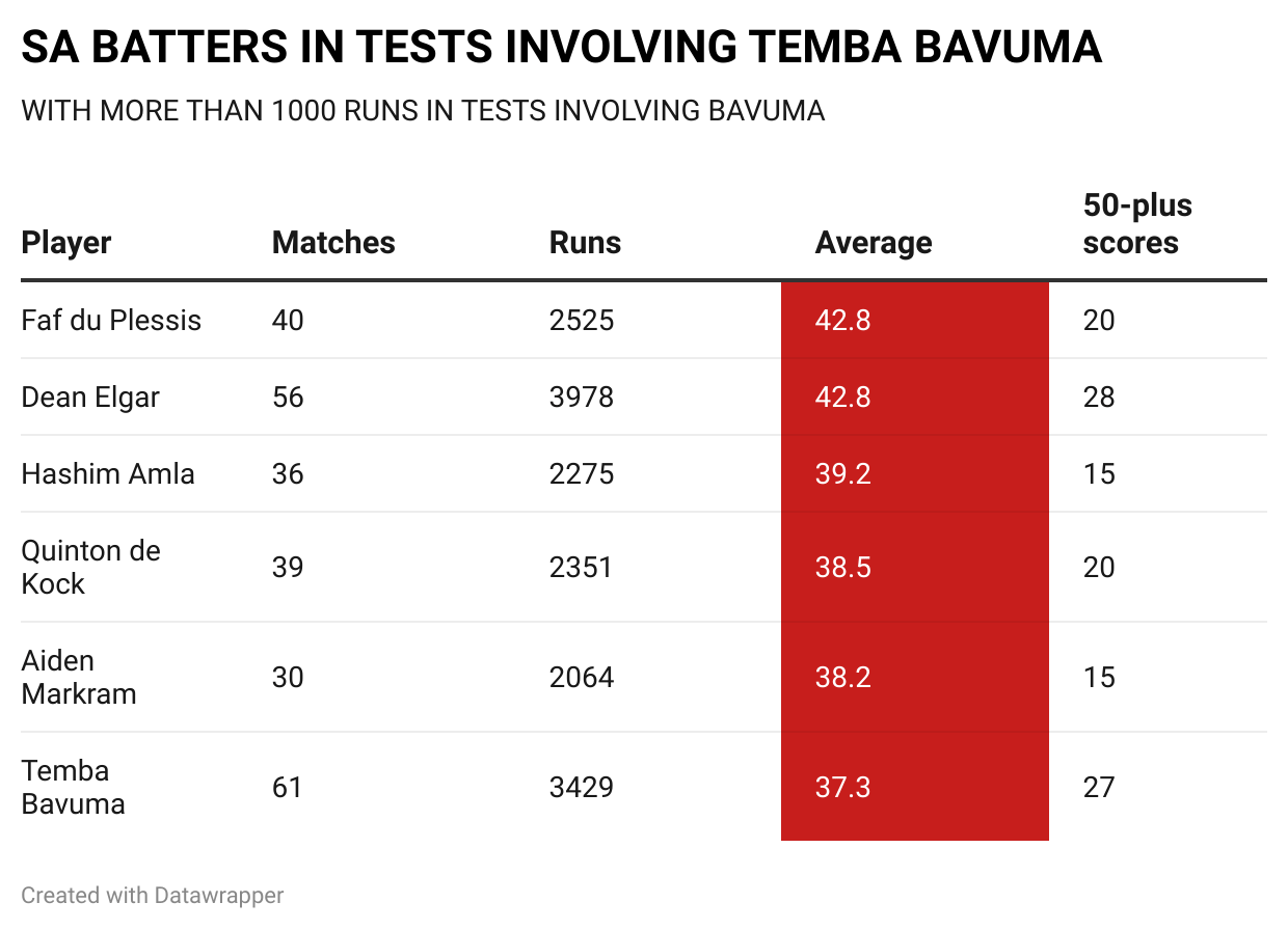 Since 2014, the batting average for the top six batters in South Africa has been 33.1, the third lowest among all Test-playing countries. Bavuma has played most of his games in South Africa and has averaged 42.8, around 10 runs per dismissal better than the benchmark.