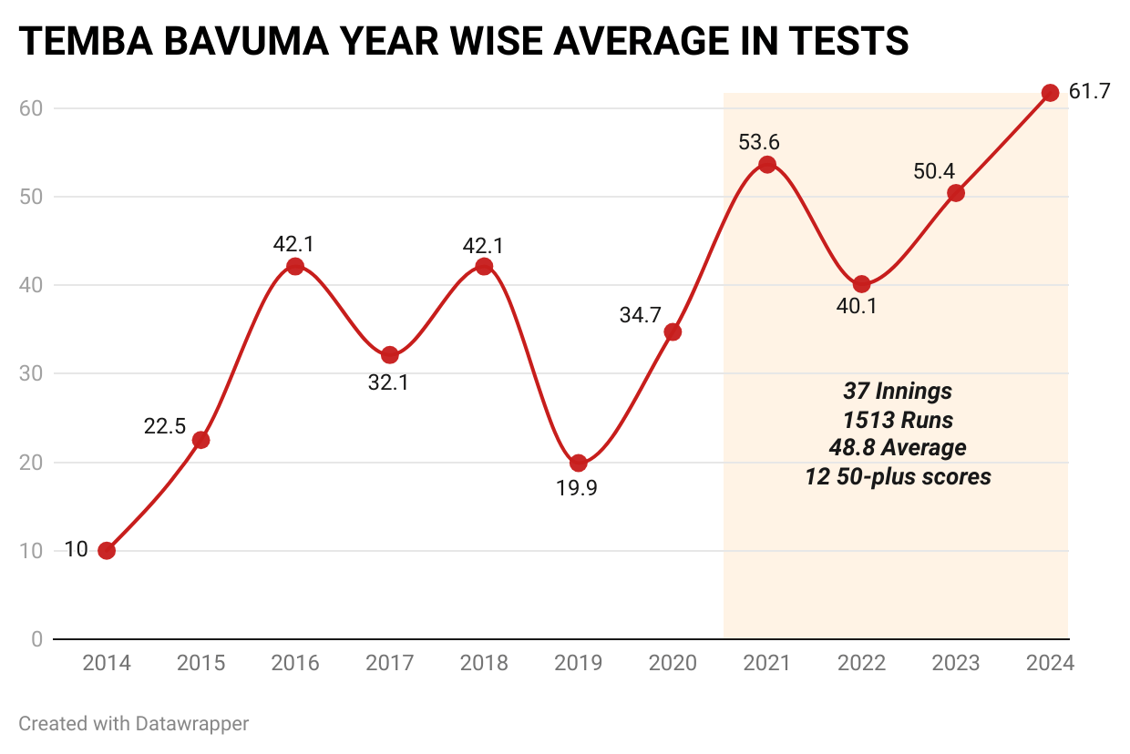 The series could well be the starting point of Bavuma mending his underwhelming numbers as a Test batter. He has averaged 40-plus in each of the last four years but this is the first time he has dictated terms in this fashion.