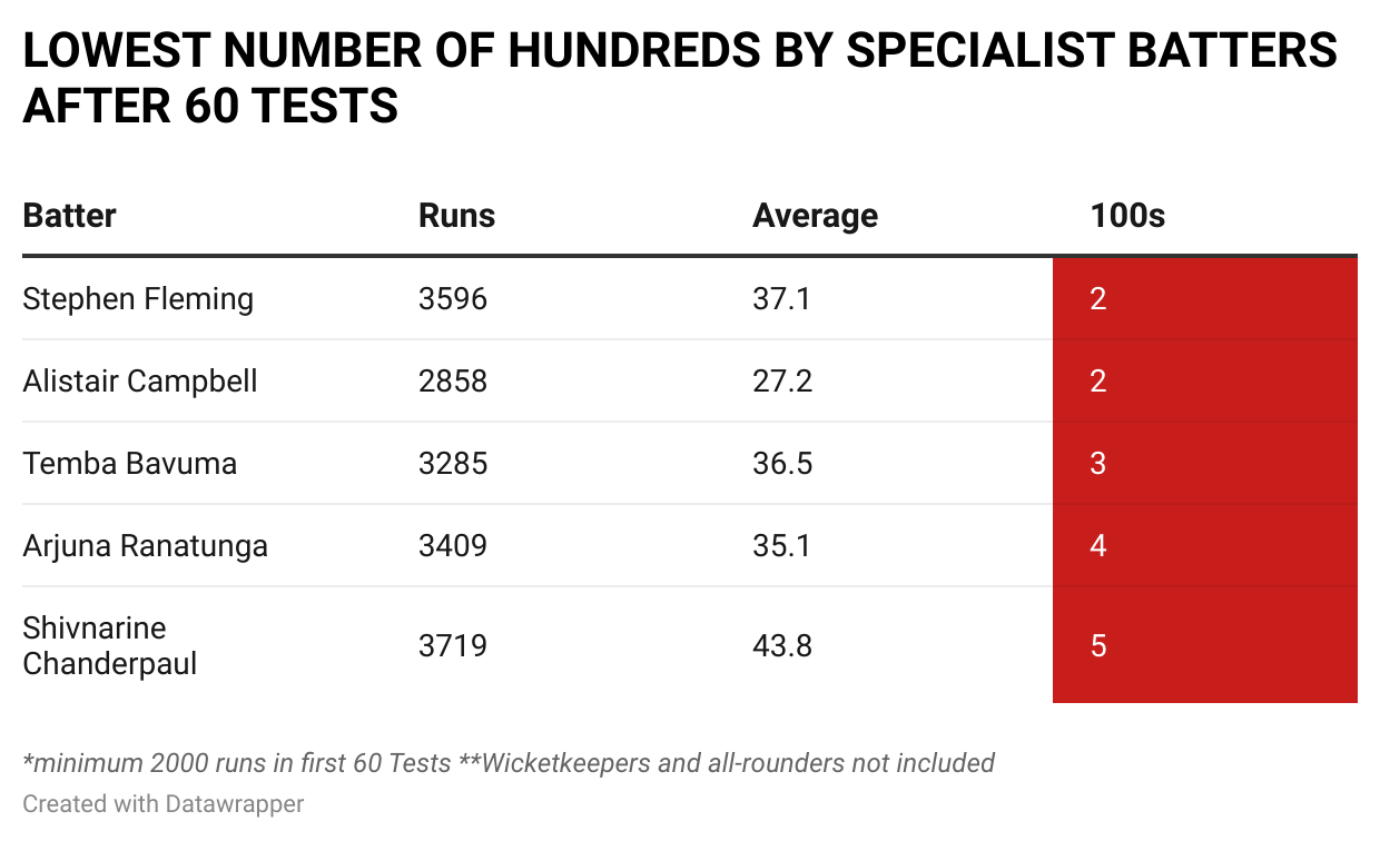 In terms of hundreds, Bavuma has only three in 61 Tests, making him one of the only three specialist batters with three hundreds or less in their first 60 Tests played (minimum 2000 Test runs).