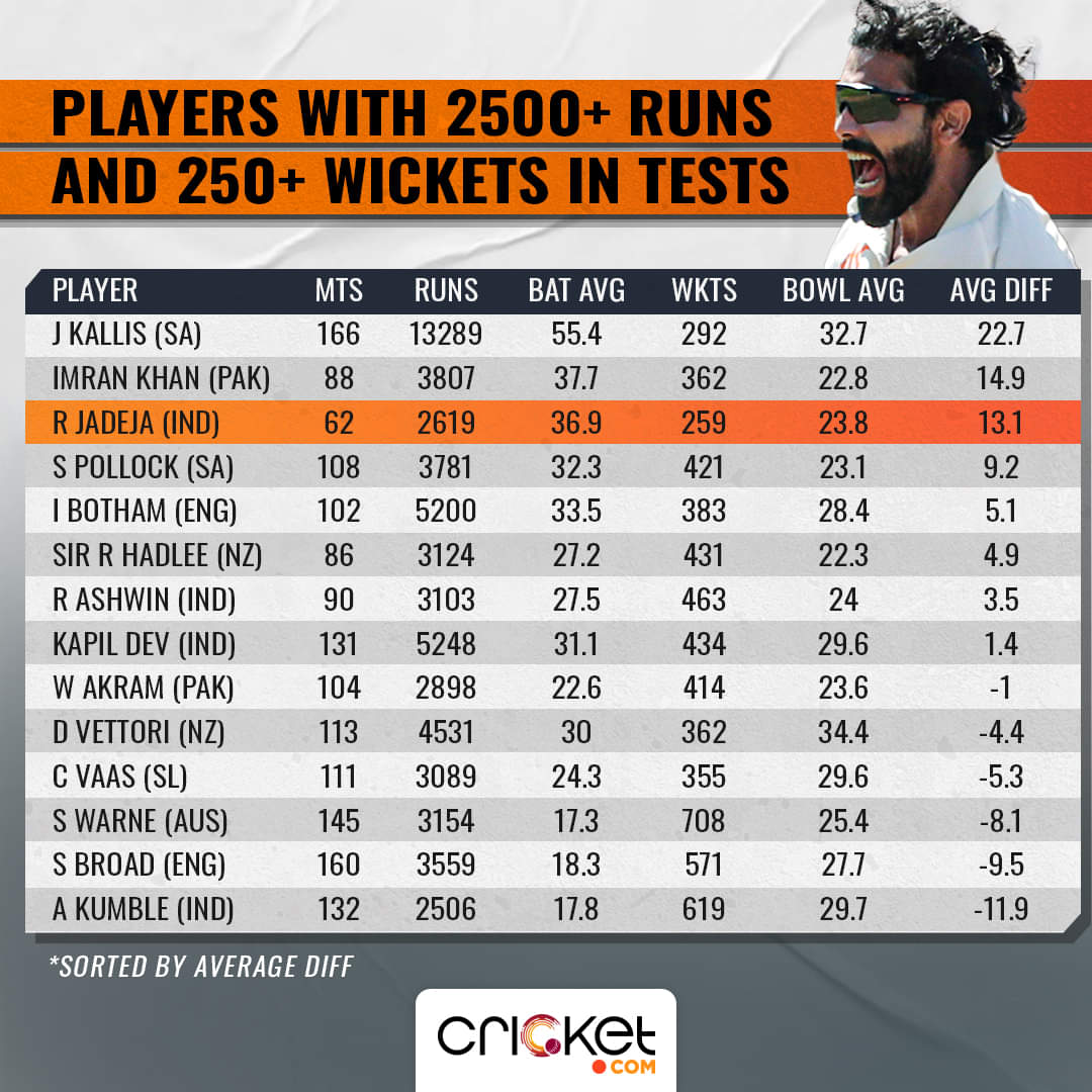 When compared with other all-rounders who have taken 250 wickets and scored 2500 runs in Test cricket and their numbers arranged in descending order of average difference, he is right up there with the best all-rounders in the 145 year history of Test cricket.