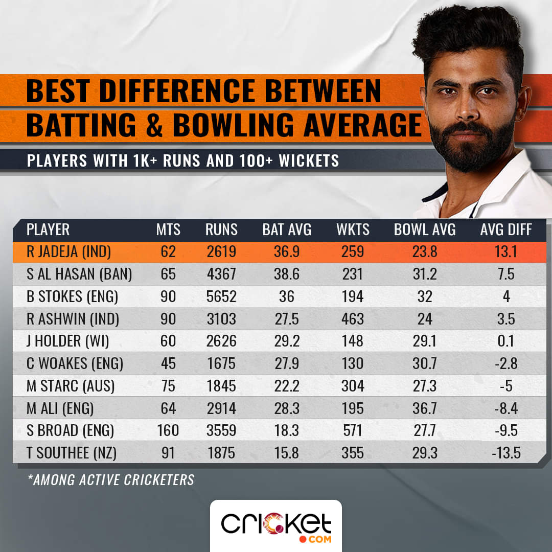 No one even comes close to Jadeja here. Deservingly, he is the best all-rounder in the world, and in ICC rankings as well. In fact these numbers are so great, that when he completed a double of 250 wickets and 2500 runs in Test cricket, he was the second fastest all-rounder ever to achieve that, just behind Sir Ian Botham.