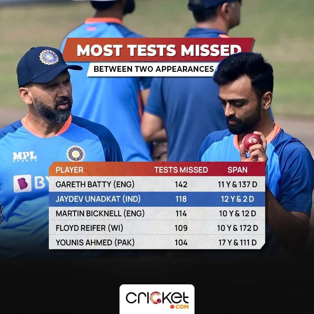 Jaydev Unadkat's perseverance in donning the national colours has finally succeeded, as he was named in the playing XI of the Indian side for the second Test against Bangladesh. The left-arm seamer was playing international cricket after 12 years, which is the second-longest period between two games.