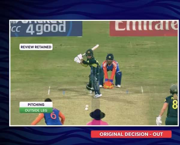 The left-handed batter had turned into a right-hander in an attempt to reverse sweep the off-spinner Deepti Sharma. While she was struck right in front of the stumps, the ball was pitching outside the off-stump. Shouldn’t it be in line because she turned into a right-hander? No.