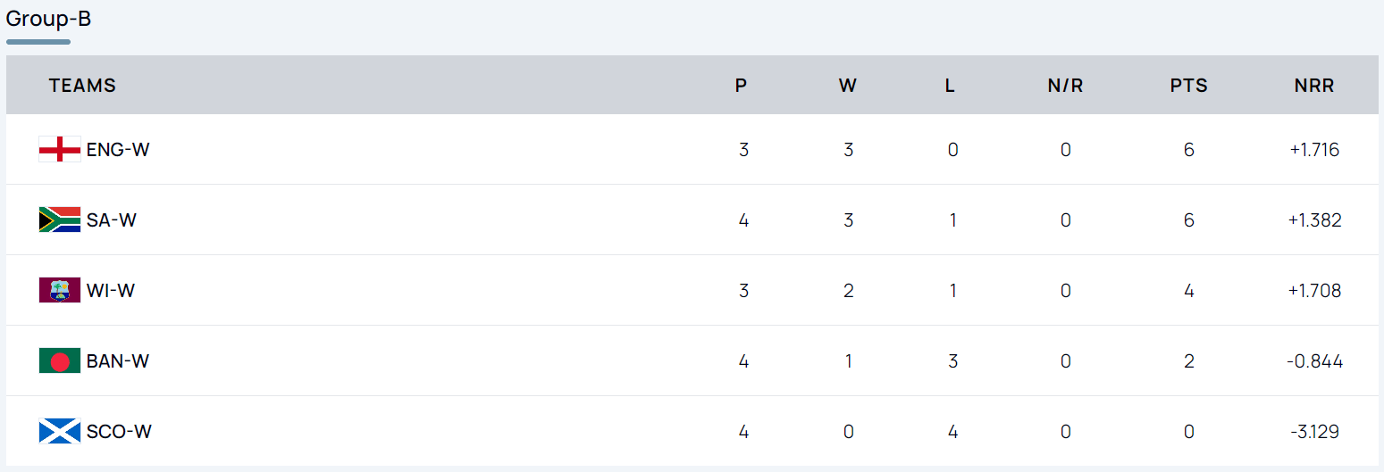 In Group B, Bangladesh and Scotland are out of the race, but England, South Africa and the West Indies are very much alive. If England win, they will be through alongside South Africa. If the West Indies beat England, they will be through. Then, depending on their NRR, one of England or South Africa will qualify.