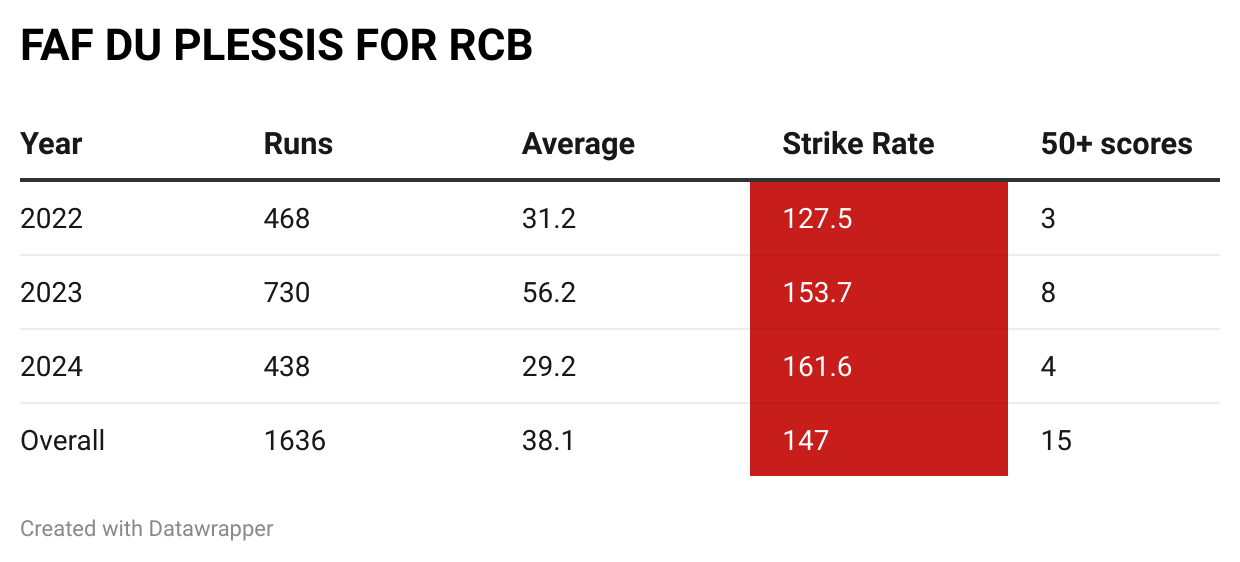 Moreover, du Plessis gave in to the team dynamics, constantly improving his strike rate, batting at 127.5 for RCB in 2022 to 161.6 in 2024. He scored 15 half-centuries in 45 innings, translating to a 50-plus score in every third innings. He thus married consistency with a higher scoring rate. Meanwhile, the right-hander also became a more reliable batter against spin.