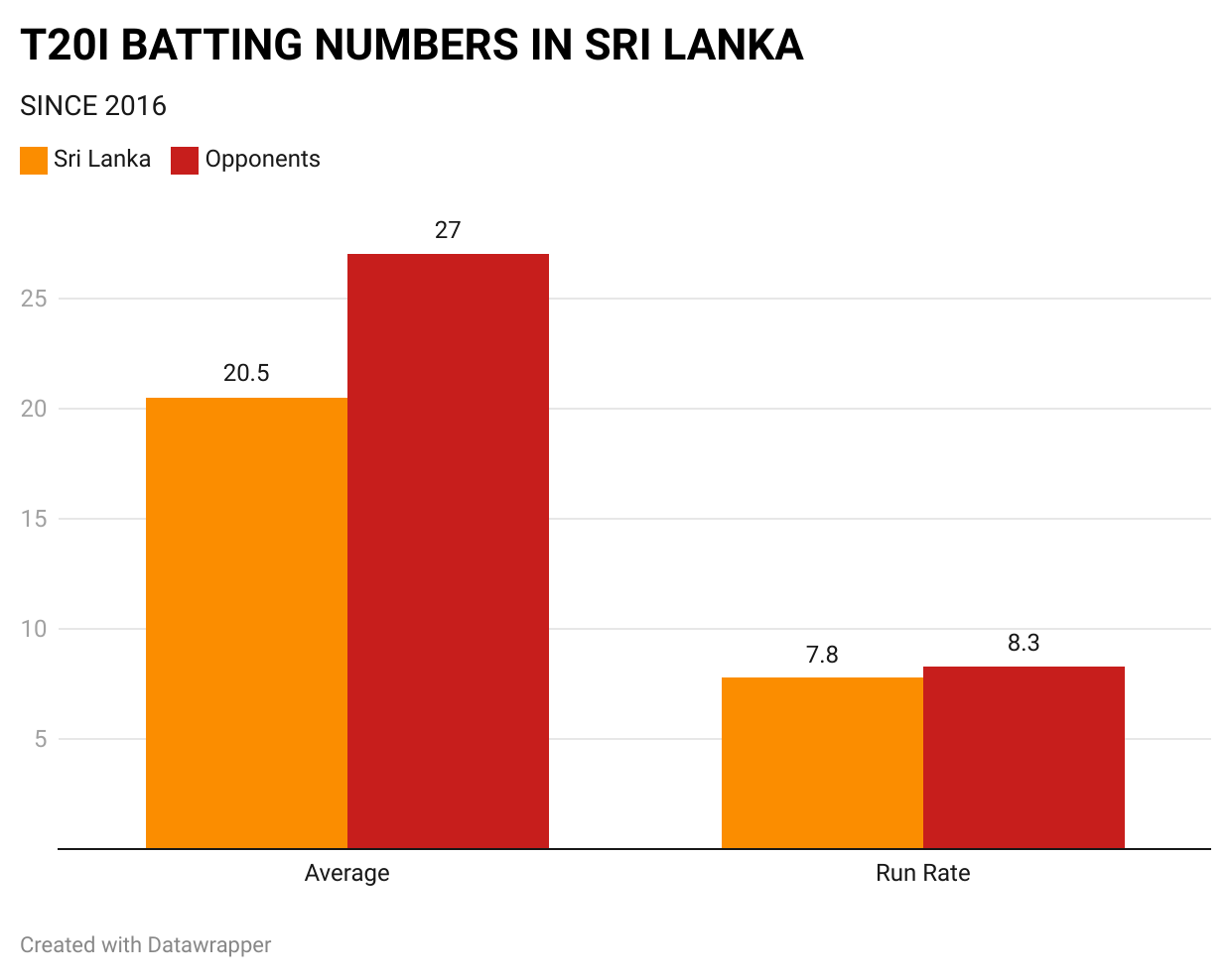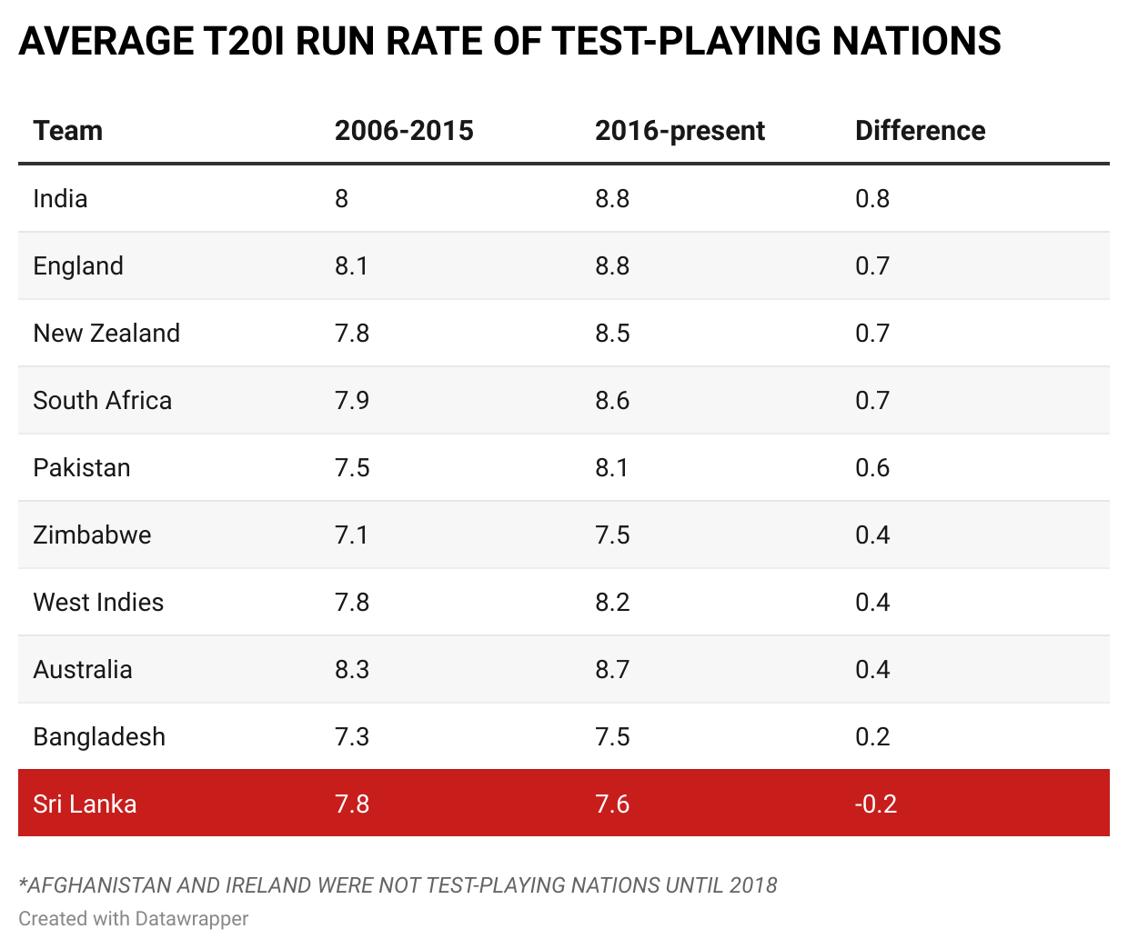 Now, Sri Lanka is the only Test-playing nation with their average T20 run rate dropping after 2016. That is the year when Dilshan retired after Sangakkara and Jayawardene had played their last T20Is in 2014.