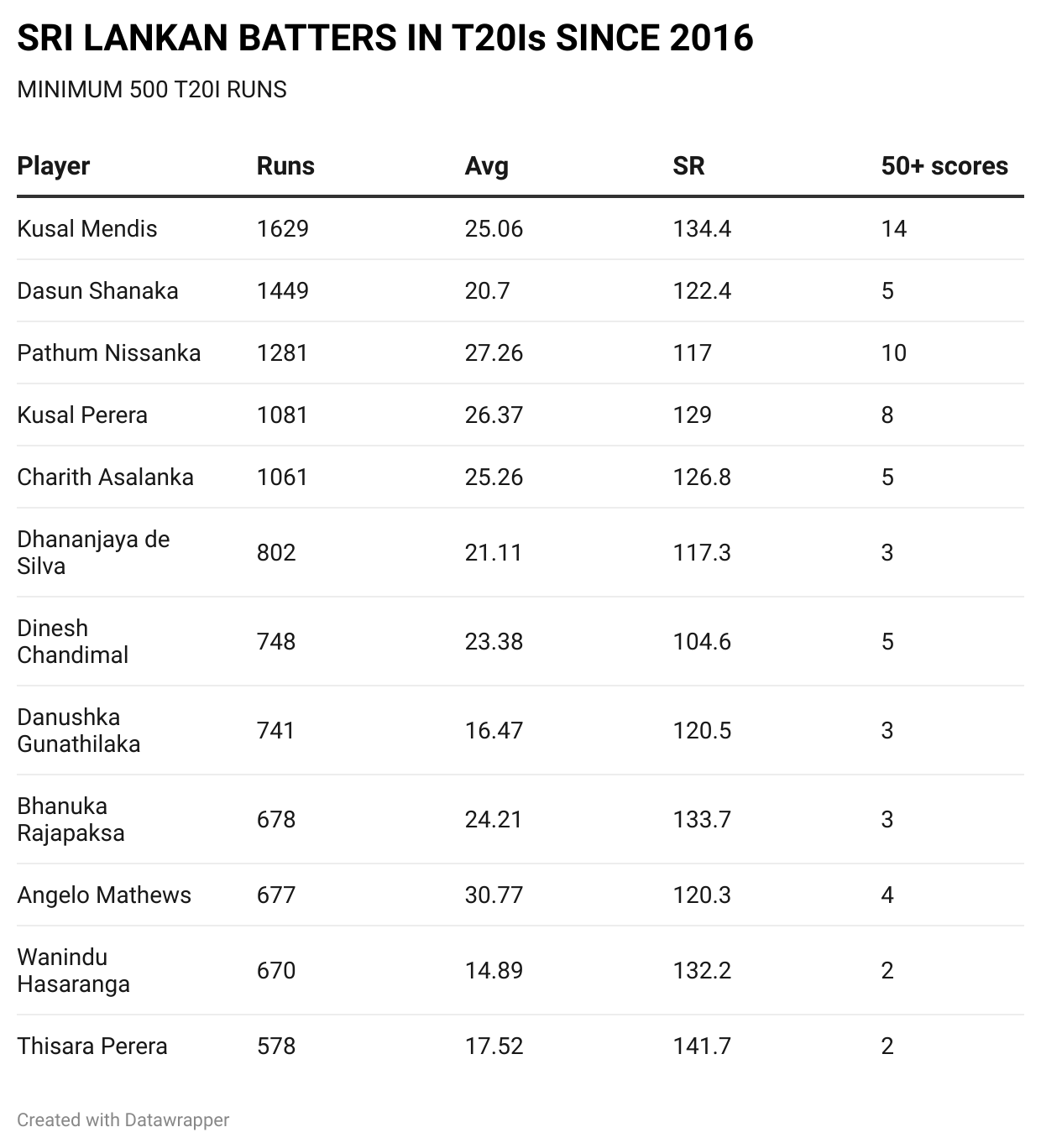 Since 2016, Sri Lanka average 20.1 in T20Is at a run rate of 7.6, lowest and second-lowest respectively among the Test-playing nations. No batter has turned up as the face of Sri Lanka’s batting. The one who has played most matches in this time frame, Dasun Shanaka, averages 21 at a strike rate of 122.2. The one with most runs, Kusal Mendis, averages 24.7 at a strike rate of 133.8.