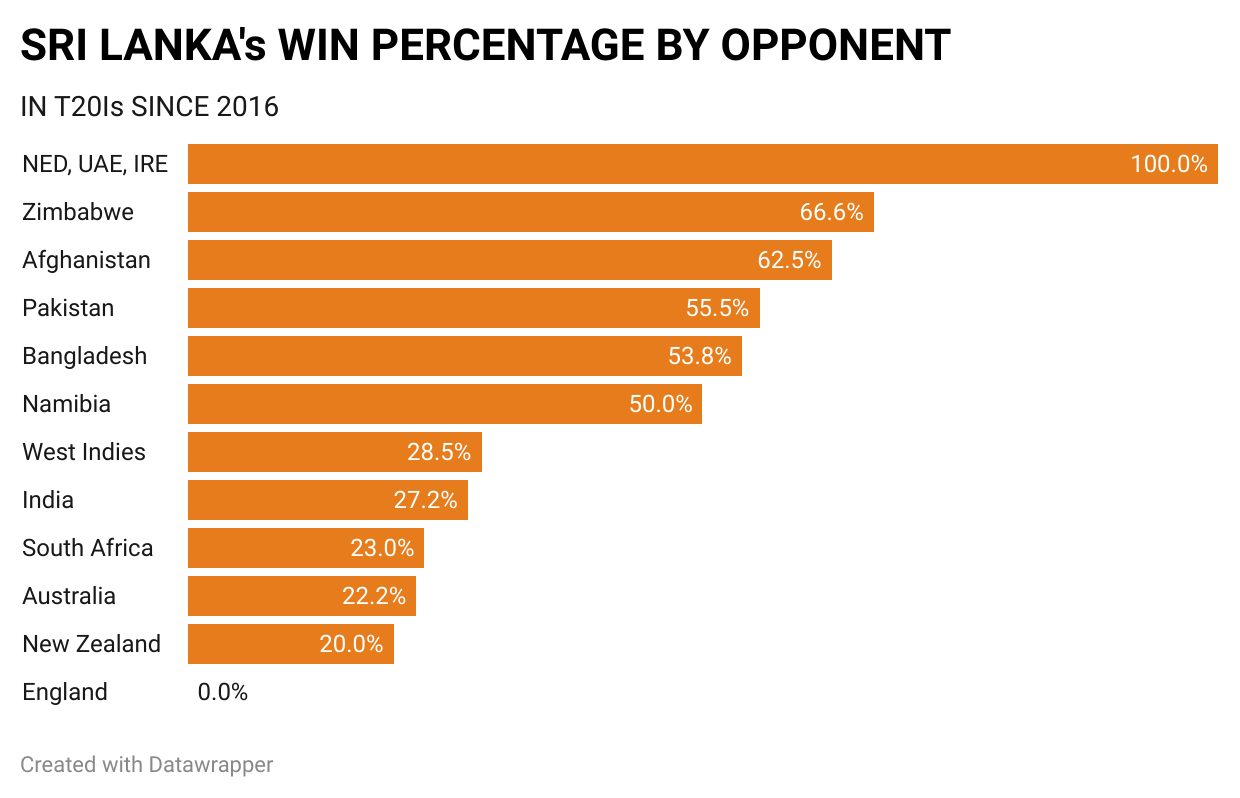 In the five T20 World Cups played in this time frame, Sri Lanka were the most consistent nation. They had a win percentage of 70.9%, the highest among all sides.