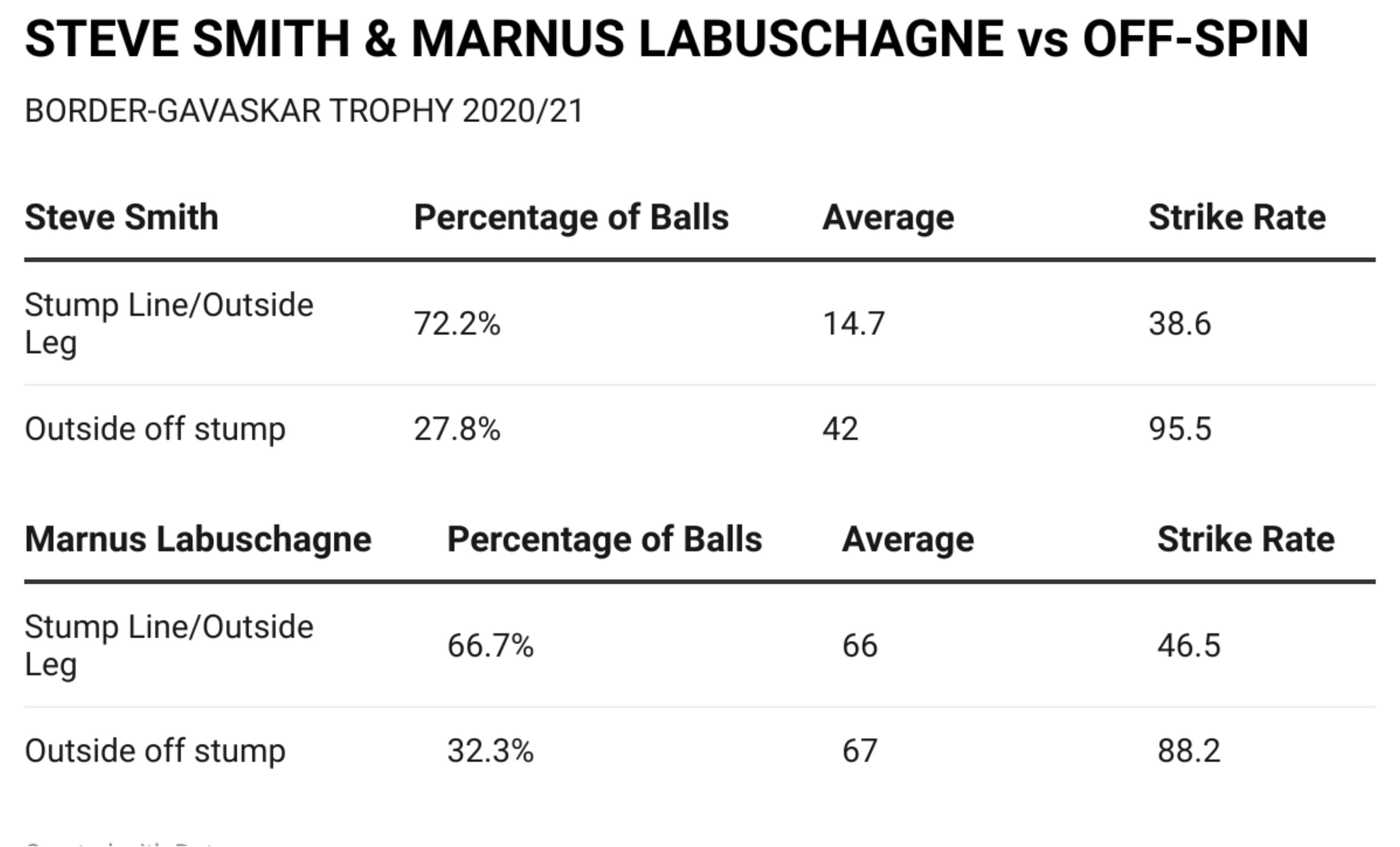 Smith faced 72.2% of his deliveries in these zones while Labuschagne had to tackle 66.7% of the total balls faced against off-spin in the same territory. They both struggled to score freely but moreover, Ashwin and Sundar challenged both edges of the bat. Smith was out caught by both the leg slip and the conventional first slip. Overall, Smith averaged only 21.5 against off-spinners in the series for four dismissals.