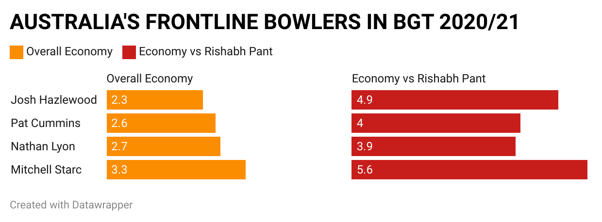 Hazlewood bowled at an economy of only 2.3 in the 2020/21 Border-Gavaskar Trophy. Except, Pant scored at 4.9 runs per over against him, the highest for any batter who faced at least 30 balls against the right-arm pacer.