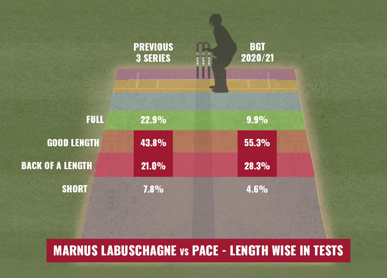 In the first 30 balls against pace, Smith’s off-side scoring percentage dropped from 38.3% in the previous three series to 32.7% against India. For Labuschagne, the number dropped from 41.8% to 34.9%.