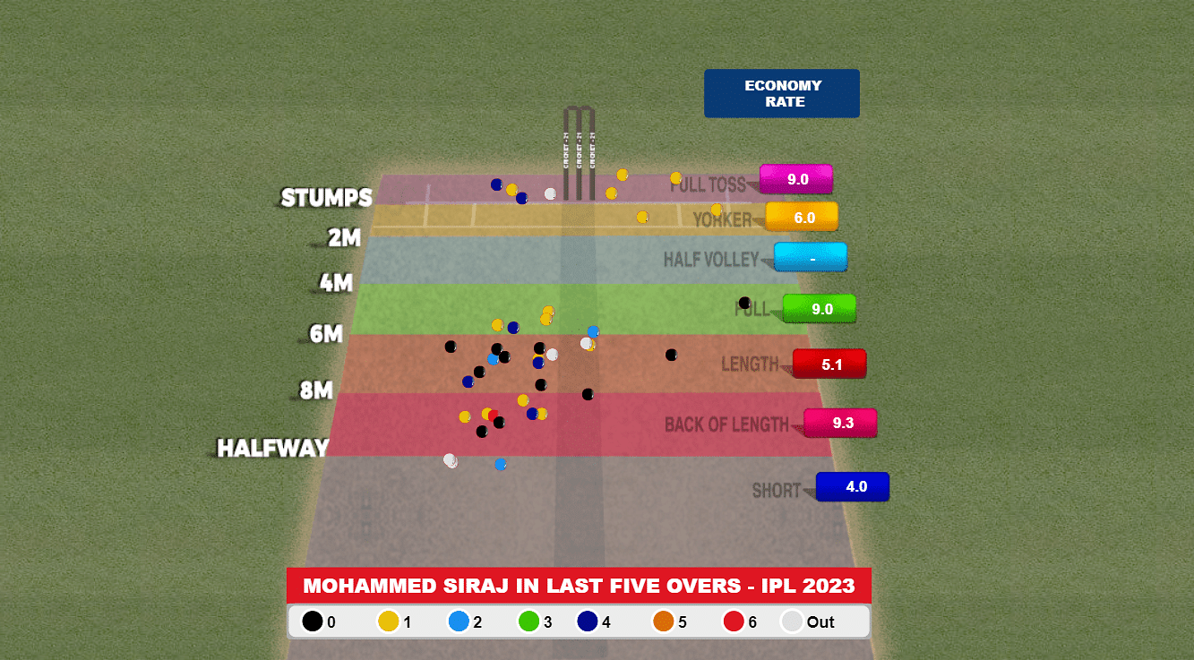 Siraj has bowled seven overs at the death in this year’s IPL, and the numbers are: 65 runs, five wickets, an average of 13.