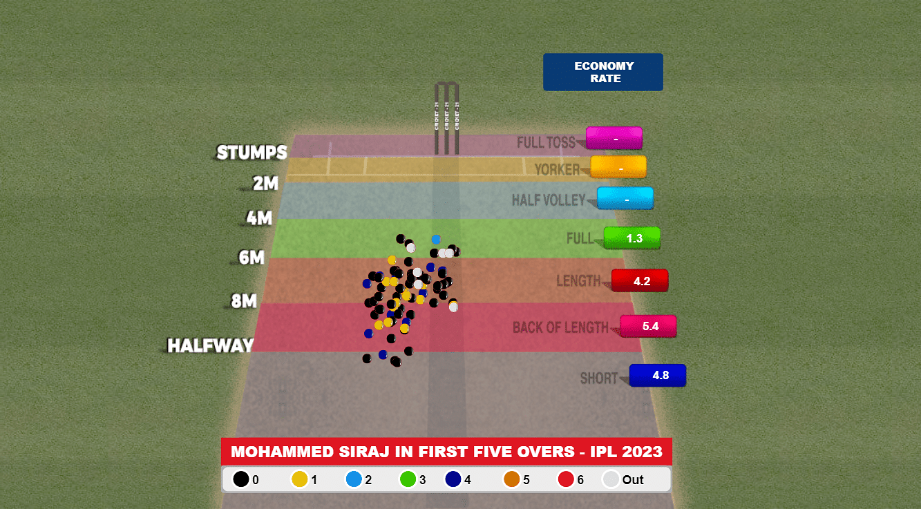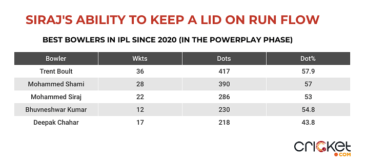 Since IPL 2020, the best bowlers in the powerplay are as follows: Trent Boult, Mohammed Shami and Siraj. In just the powerplay stage, the right-arm pacer has bowled 286 dot balls, with a staggering 53% of his deliveries being dots. Even among the three, Siraj has a control percentage of 75.2, and 20.9% of the deliveries end up hitting the wickets.