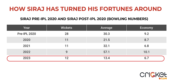 Until lockdown, the Hyderabad-born pacer had picked up just 28 wickets, and had a bowling average of 30.3, at an economy of 9.2. And Siraj’s bowling was a big double-edged sword back then. Every 4.8 deliveries, he was taken apart by the batters for a boundary.