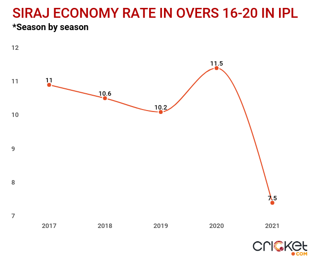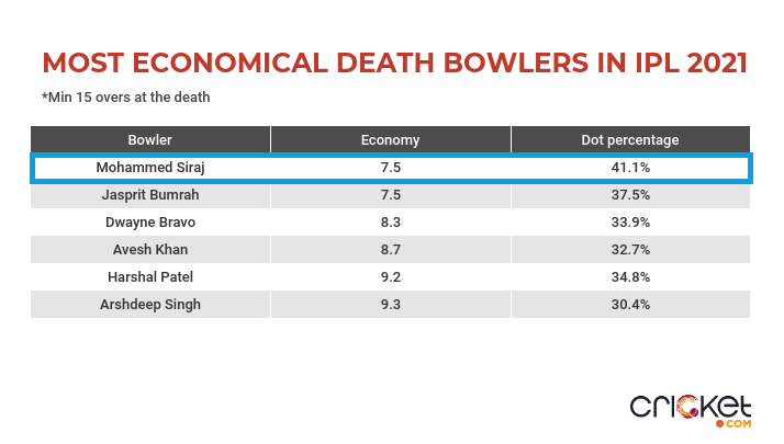 In IPL 2021, Siraj bowled 15 overs at the death (overs 16-20). Remarkably, no bowler boasted of a better dot percentage than his 41.1%, and his ER of 7.5 was joint-best alongside Jasprit Bumrah.