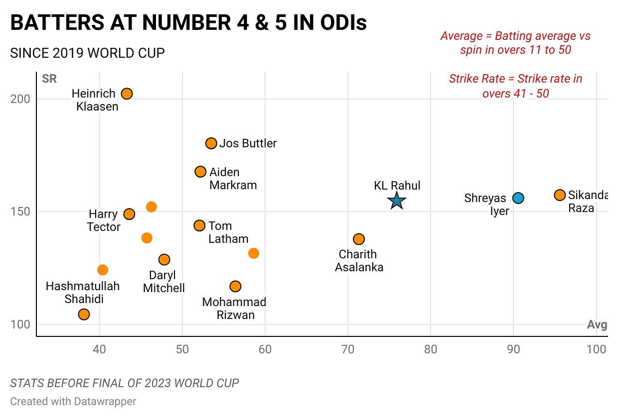 The Karnataka batter has ended this World Cup as the highest run-scorer at number five - 452 runs. He also has the second-best average in that spot (77.2, after Azmatullah Omarzai’s 82.8) and the fifth-highest strike rate (98.7).