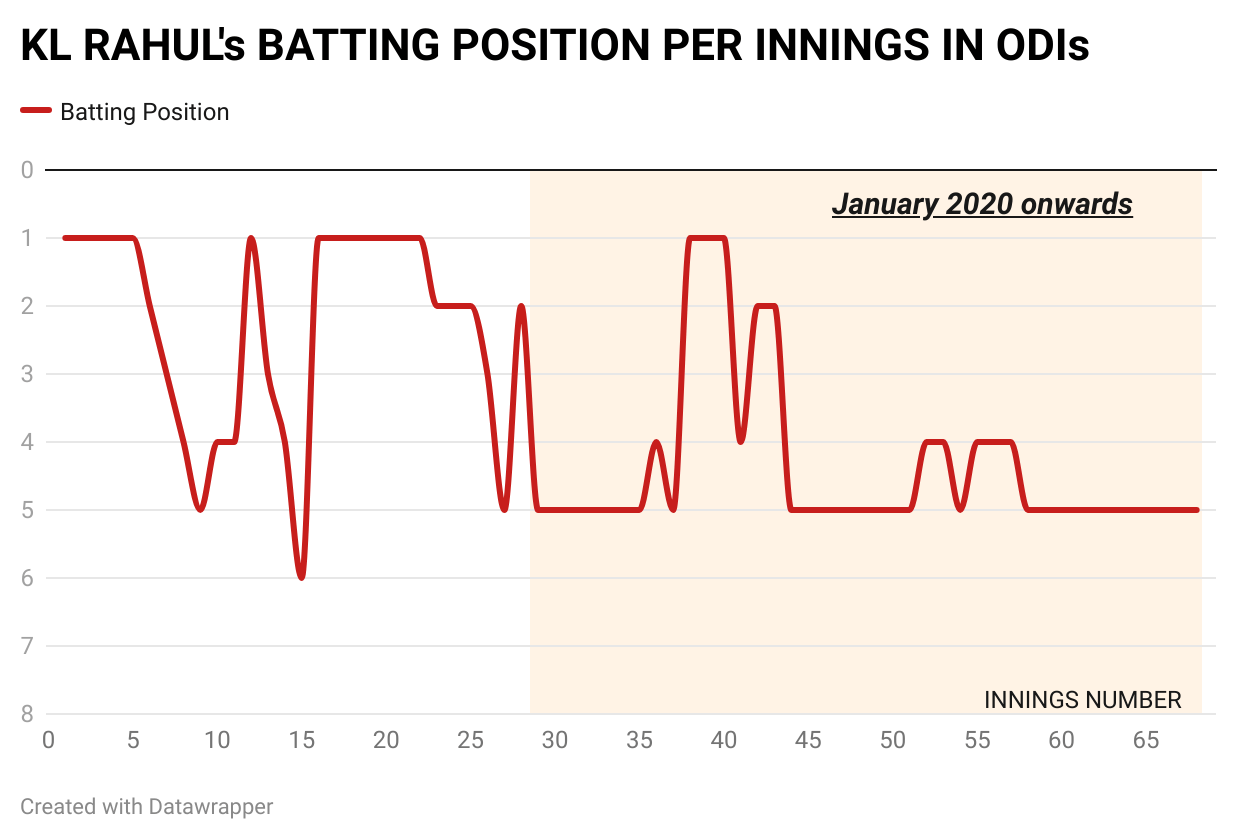Rahul’s second life as a number five batter in Indian colours began when concussion ruled out Rishabh Pant from the second ODI against Australia in January 2020. Rahul, who had batted at three in the first fixture, was moved to number five, and the Karnataka batter scored 80 off 52 balls. He has since been preferred in the middle-order with the additional responsibility of being the first-choice wicketkeeper.