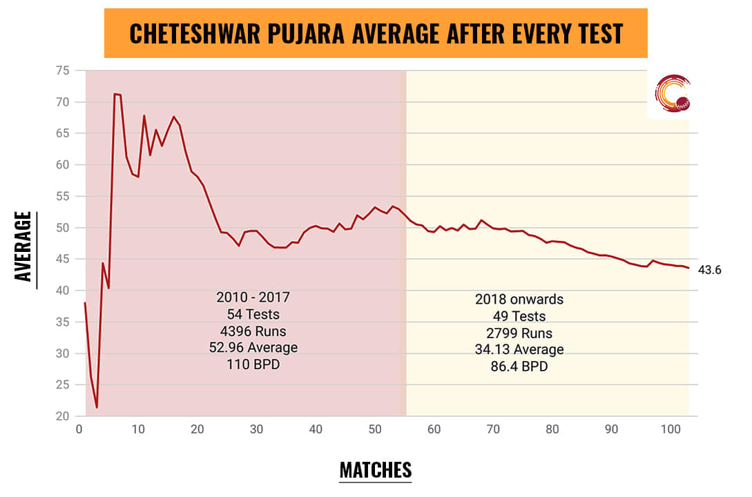 Pujara’s contributions was about spending time in the middle than scoring runs. Also, they didn't come consistently enough. His balls-per-dismissal ratio fell from 110 in his first 54 Tests to 86.4 since 2018.