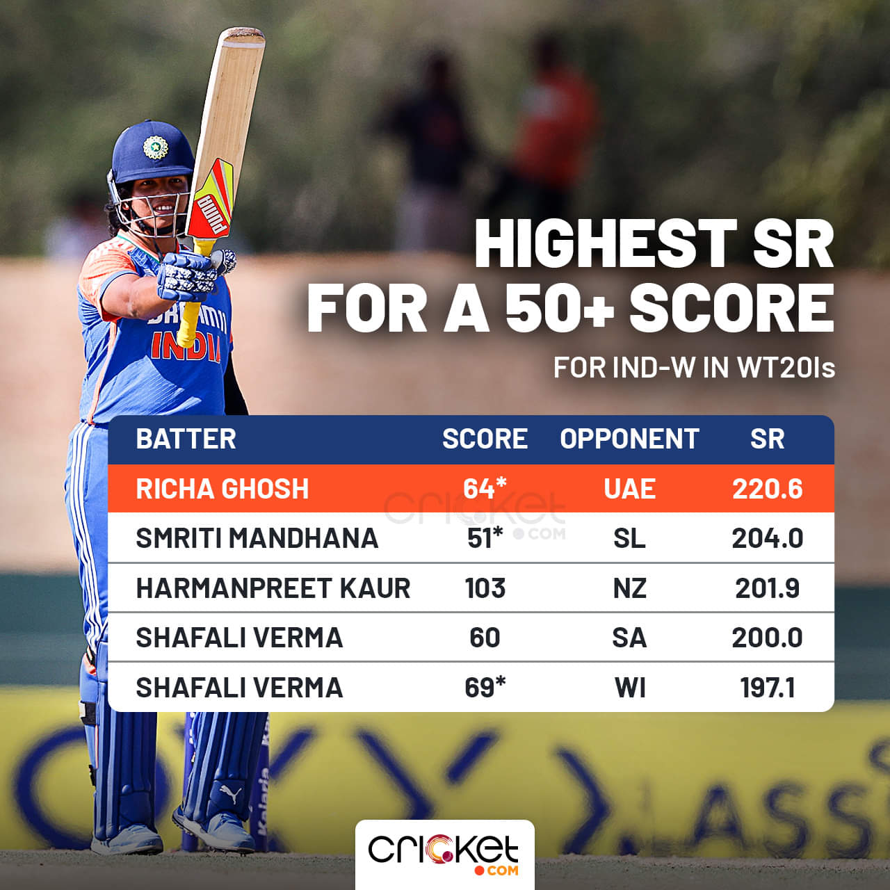 The incredulity of the above stat will get heightened further if you allow me to just tell you what she did on the last five balls of her innings against UAE, where she scored the fastest-ever 50-plus score in the history of T20I cricket for an Indian woman.