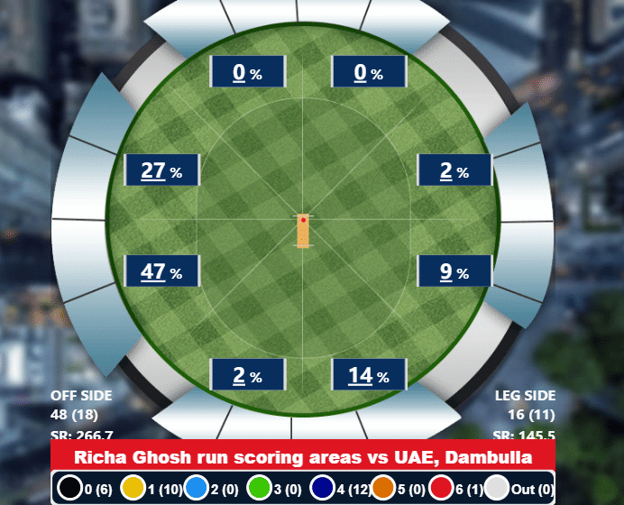 But today, against the UAE, it was her off-side play that stood out. She not only scored 75% of her runs in that region, but she did it with such finesse that it never felt like she was muscling the ball. In fact, in her innings that was played at a strike rate of 220.68, she hit just one six! All her remaining big shots were fours.