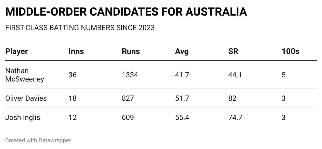 Probably the least likely option but definitely on the cards. Australia could continue with a makeshift Test opener (Smith or Head), and considering India’s bowling might, they may name a specialist middle-order batter, with candidates in Josh Inglis, Oliver Davies and Nathan McSweeney.