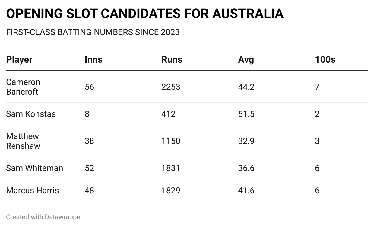The Aussies have a handful of options for this role – Cameron Bancroft, Marcus Harris, Matt Renshaw, Sam Konstas and Sam Whiteman.
