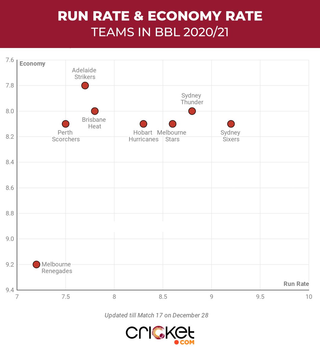 But all is not rosy for the team with the lowest win percentage in BBL history. After a re-modelled action, Chris Green, with an economy of 8.9 has not been as effective as he used to be earlier. Also, Daniel Sams who had an economy of 7.8 in the last season and picked 15 wickets in the death overs - the most by any bowler – has looked out of touch so far. However, he has made up for an unimpressive economy of nine with 87 runs of 38 balls in the season so far.