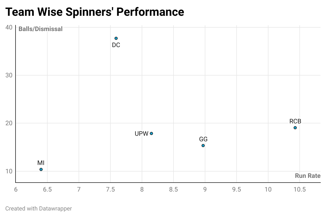 DC’s batters have been the best at maximizing the powerplay. They have scored at 9.6 RPO & average 57.4, the best amongst all teams on both counts. Meanwhile, GG’s bowlers have really struggled to get the early breakthroughs. They have been the most expensive bowling unit, and have only 6 wickets to show for. Only UPW have taken lesser wickets.