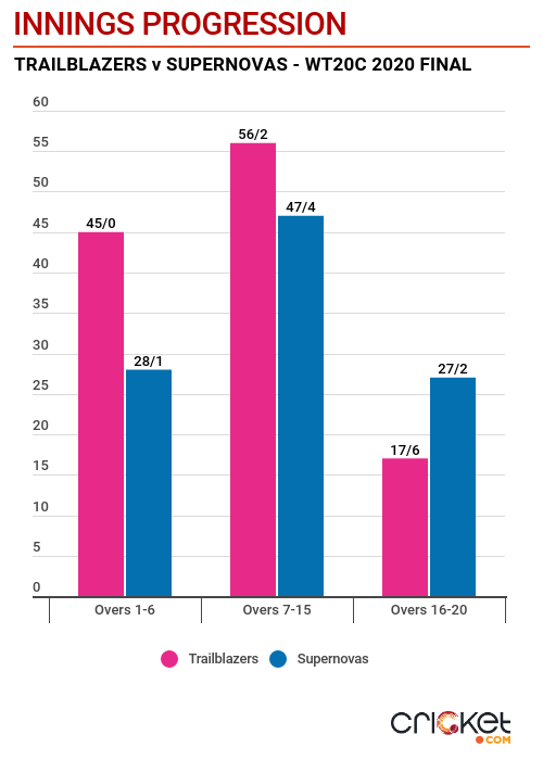 Trailblazers needed early wickets, especially of Chamari Athapaththu. The leading run-getter of the tournament could have easily killed the game in few overs but the top-ranked T20I bowler Sophie Ecclestone sent her back to the hut only in the second over. After being swept for four, the left-arm spinner pinned Athapaththu (6) right in front of the stumps with a quicker one. With Priya Punia not playing, Jemimah Rodrigues was sent out to open the innings, while Taniya Bhatia too was promoted to No. 3. Trailblazers were not going down without a fight and they didn't allow Rodrigues and Bhatia to score freely.