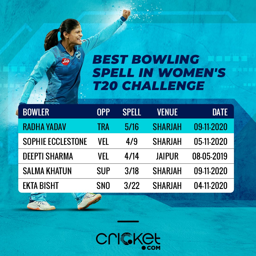 That's when the collapse happened. The departure of Mandhana affected Trailblazers' scoring rate as Richa Ghosh and Deepti Sharma failed to hit those boundaries. The spinners offered no pace to the batters and Radha got rid of both Ghosh (16-ball 10) and Deepti (10-ball 9) in the 18th over to turn the momentum in Supernovas' favour. The left-arm spinner, who defended nine runs off the final over in the last game, picked three more wickets in the last over and became the first bowler to take a five-wicket haul in the history of the Women's T20 Challenge.