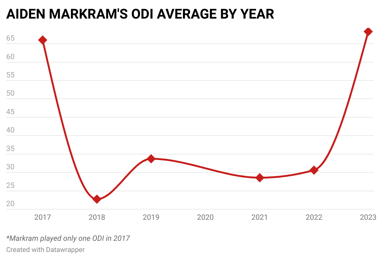 Since his debut in 2017, Markram averaged only 28.6 with the bat until the end of 2022. In 41 innings, he had managed only nine 50+ scores without any triple-digit figures. 2023 is where the runs have come.