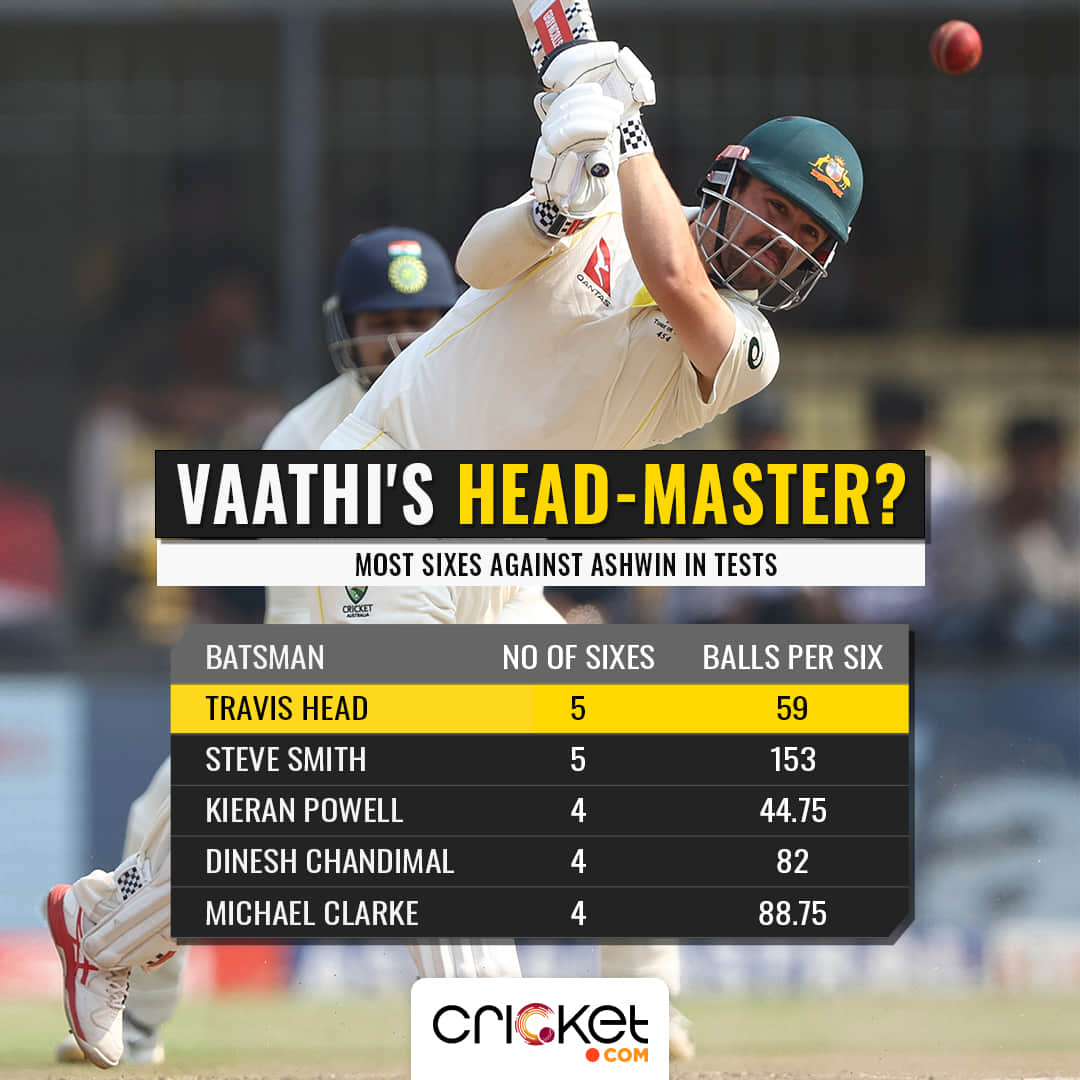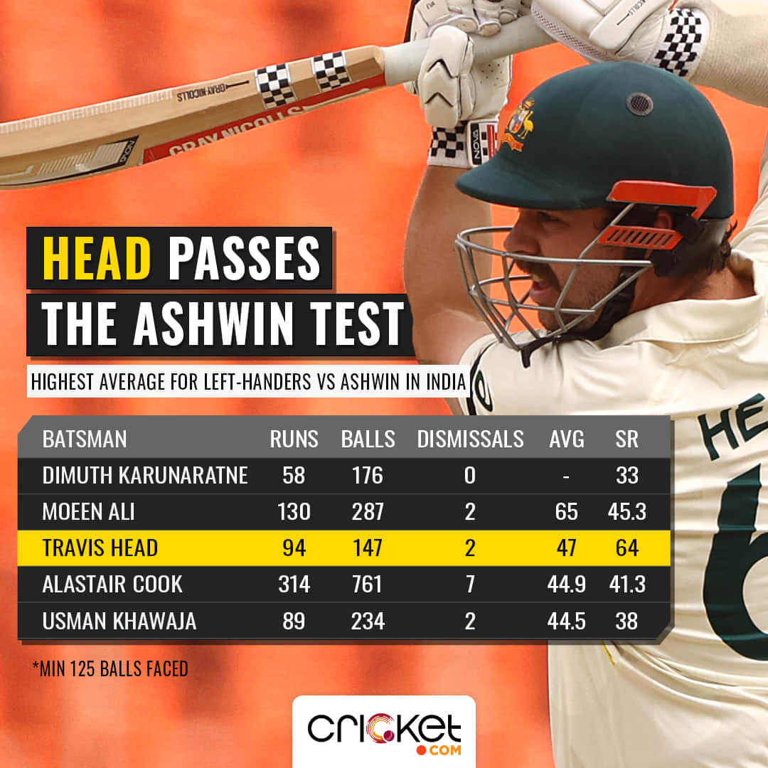 Across the three Tests in which he played, Head faced 147 balls of Ashwin. He remarkably not only averaged 47.00, he also struck at a SR of 64.