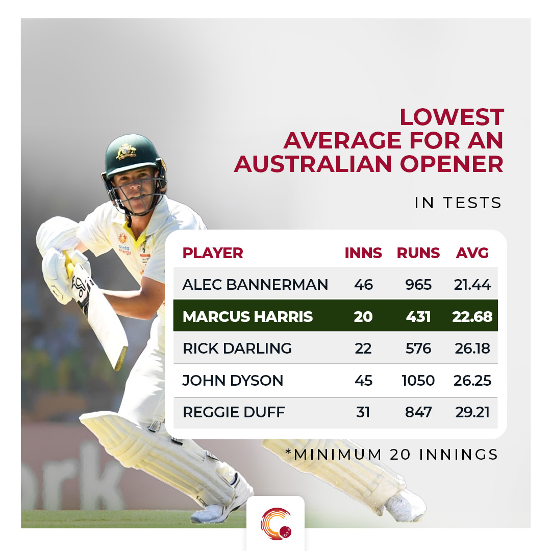 The southpaw endured yet another tough outing with the bat as he was caught in the slip cordon for three runs by Dawid Malan. In Tests, Harris has scored 431 runs in 20 innings at an average of 22.68, which is the second-lowest by an Australian opener with a minimum of 20 innings. Alec Bannerman, with 965 runs in 48 innings at an average of 21.44, is the lowest for the home team.