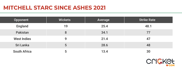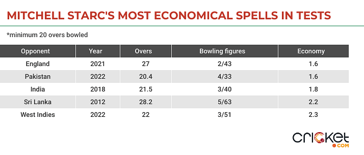 Since Ashes 2021/22, Starc has managed to maintain an ER of 2.96, which is significantly better than his career ER of 3.29. Never in his career has the 32-year-old maintained a lower economy across such a large stretch of matches (13 Tests).